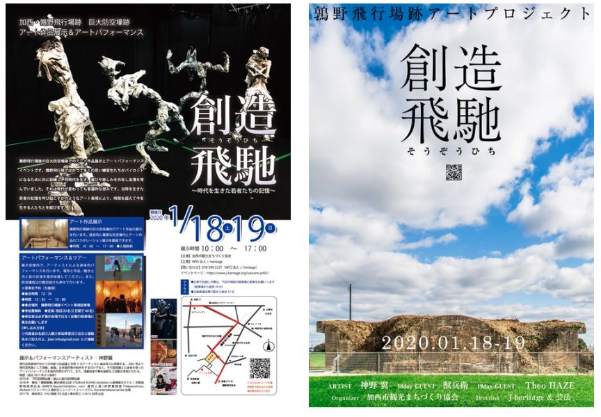 鶉野飛行場跡の巨大防空壕跡でのアート作品展示とアートパフォーマンスイベントです。鶉野飛行場ではかつて多くの若い練習生たちがパイロットになるために共に訓練し、同時代を生き、喜びや悲しみを共有し友情を育んでいました。それは時代が変わっても普遍的な営みです。当時を生きた若者の記憶を呼び起こすかのようなアート表現により、時間を超えて今を生きる人たちとを結びます。
