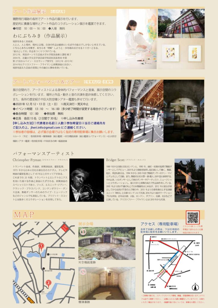 展示空間内で、アーティストによる身体的パフォーマンスと音楽、展示空間のコラボレーションを行います。場所と作品・動きと音の共演を是非体感してください。また、各所の歴史紹介や巨大防空壕シアター鑑賞も併せて行います。